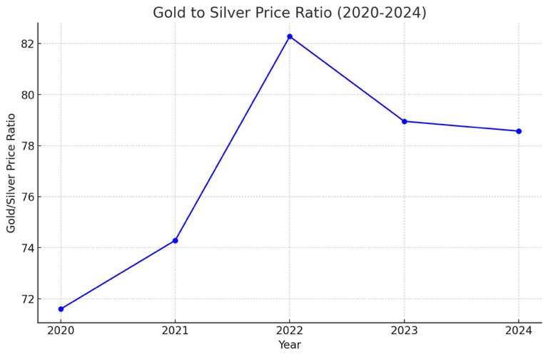 예를 들어 현재 금/은 비율이 약 78인 상황에서는, 이 비율이 역사적 평균(60-70)을 초과하므로, 은이 상대적으로 저평가되었을 가능성을 뜻합니다. 당연한 이야기 이겠지만 이는 다른 경제적 요인과 함께 고려되어야 하고 단순히 비율만으로 투자 결정을 내리는 것은 위험할 수 있겠죠?