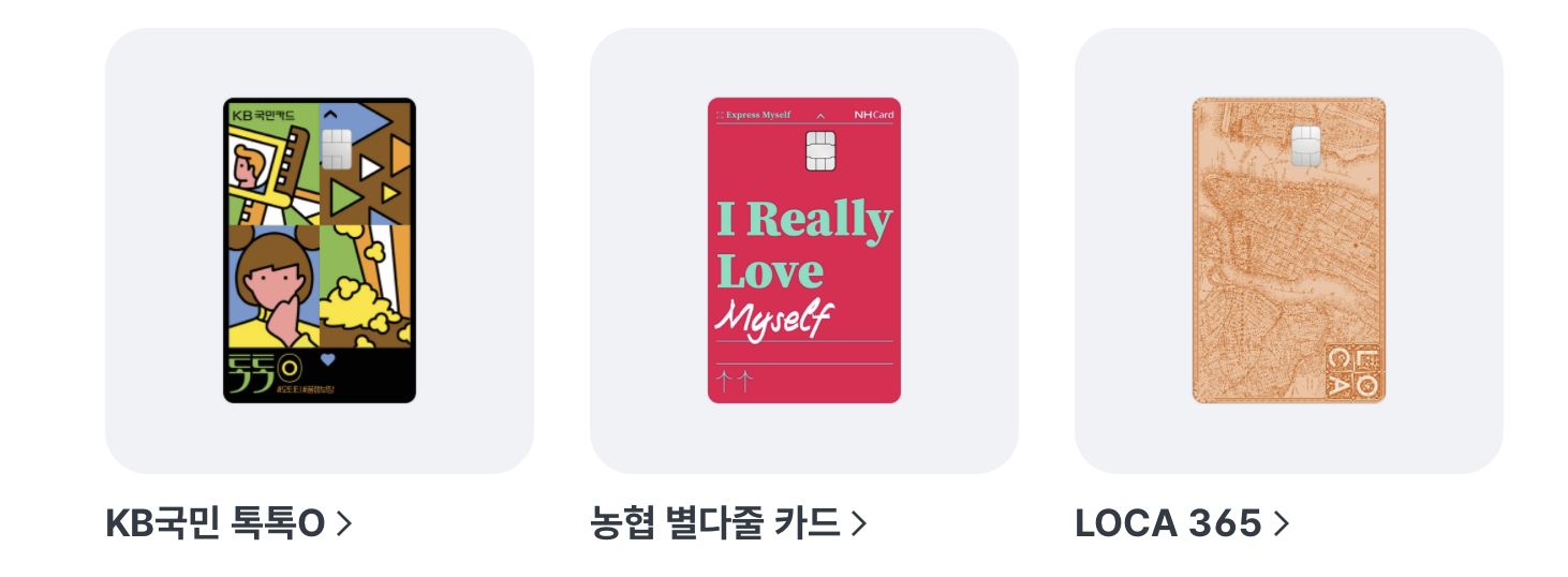 • LOCA 365 카드 : 전월 실적 50만 원으로 다소 혜택이 적은 듯 보일 수 있지만 현재 신용카드 중에서 고정비용 전용 할인 혜택을 주는 대표적인 카드로서 아파트관리비, 공과금, 통신비용, 대중교통, 보험료, 학습지, 배달앱에서 10% 할인이 되고 디즈니플러스 및 스트리밍에서는 1,500원이 할인. 다른 비용들과 같이 할인받을 경우 최대 월 36,500원 할인 가능.(연회비 13,000원)