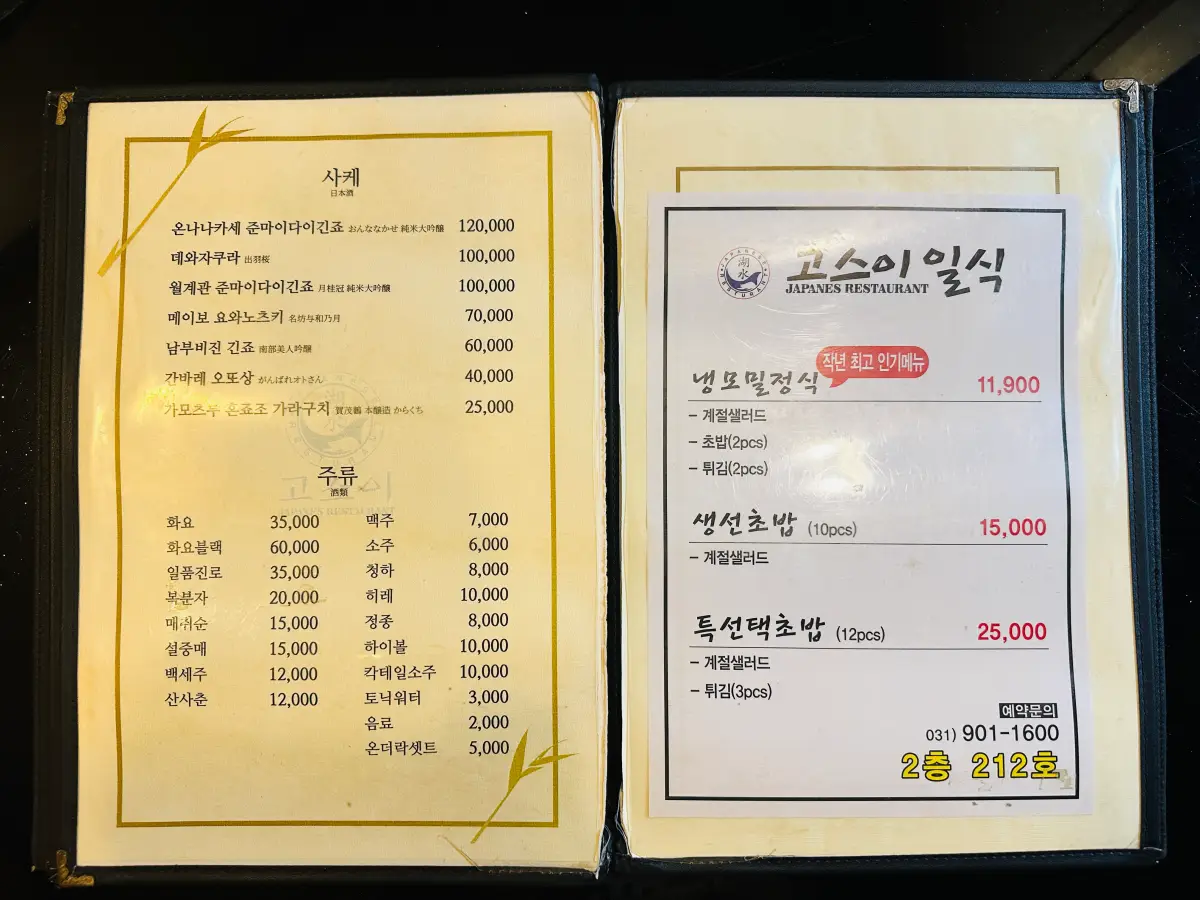 고스이의 메뉴 구성은 아래 메뉴판에서 볼 수 있듯이 런치 특선, 디너 특선, 단품요리(좌측 메뉴판) , 주류(우측 메뉴판)로 오늘 우리는 특정식(디너특선_35,000원)으로 주문하였고 차를 가져온 관계로 술은 시키지 않았다. (사시미정식(디너특선)과 차이는 전복 정도로 볼 수 있겠다.)