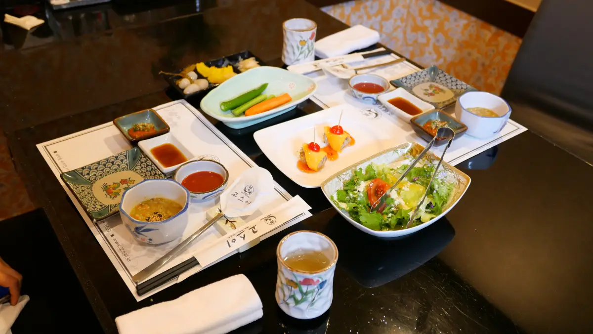 본격적으로 주문한 메뉴들이 코스 순서 대로 차례대로 나오는데, 첫 상차림은 여느 일식집과 비슷하게 전복죽과 각종 야채들 그리고 "치즈 야채 말이"