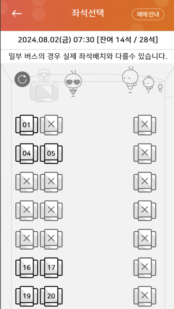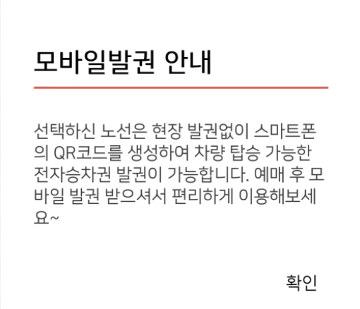 모바일 발권(QR) 및 좌석 선택 후 왕복, 편도 여부에 따라 다음 티켓 예매.