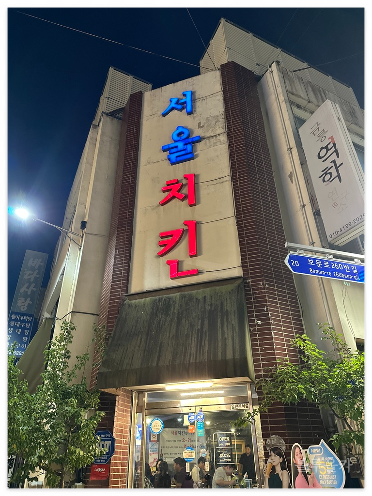 대전을 떠나는 길에 예전에 테슐렝가이드(테슬라모임의 맛집 커뮤니티)의 추천을 받았던 대전의 맛집 서울치킨. 늦은 시간이라 얼른 포장하고 기다리는 시간을 이용하여 대전의 번화가? 대흥동 불금의 거리를 거닐었고, 포장한 치킨과, 성심당에서 포장한 빵들은 트렁크에서 작동 중인 냉장고에 고이 보관하여 다음 목적지에서 먹기로 하였다.