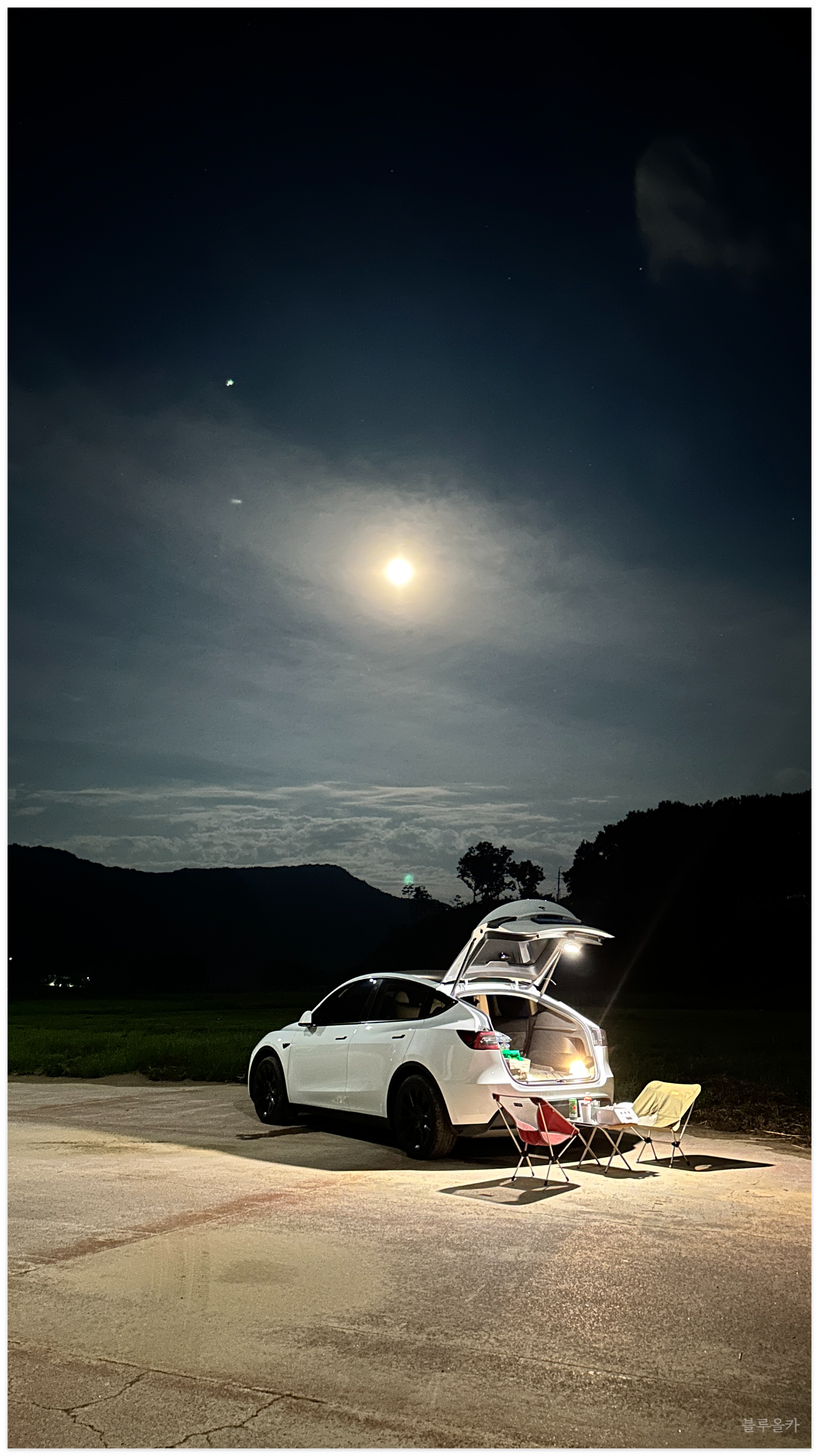 부산까지 바로 내려갈 수 있었지만 하늘도 좋고 달도 좋아서 금강변 어느 한적한 곳에 차를 대고 차에서 자기로 했다. 비가 많이 온 다음날이고 강변이라 그런지 습기가 상당했지만 강바람도 제법 불고, 시원했다. 냉장고에서 꺼낸 맥주와 치킨, 성심당 빵이 우리를 기다렸고 시원한 강바람과 한잔 하며 낭만과 궁상의 사이 어디에선가 길지 않은 토론을 통해 우리는 오늘밤을 낭만이라 결론짓게 되었고, 모델 y의 에어컨 바람과 차박매트의 최강자 스텔라 매트와 함께 꿀잠을 청했다.
