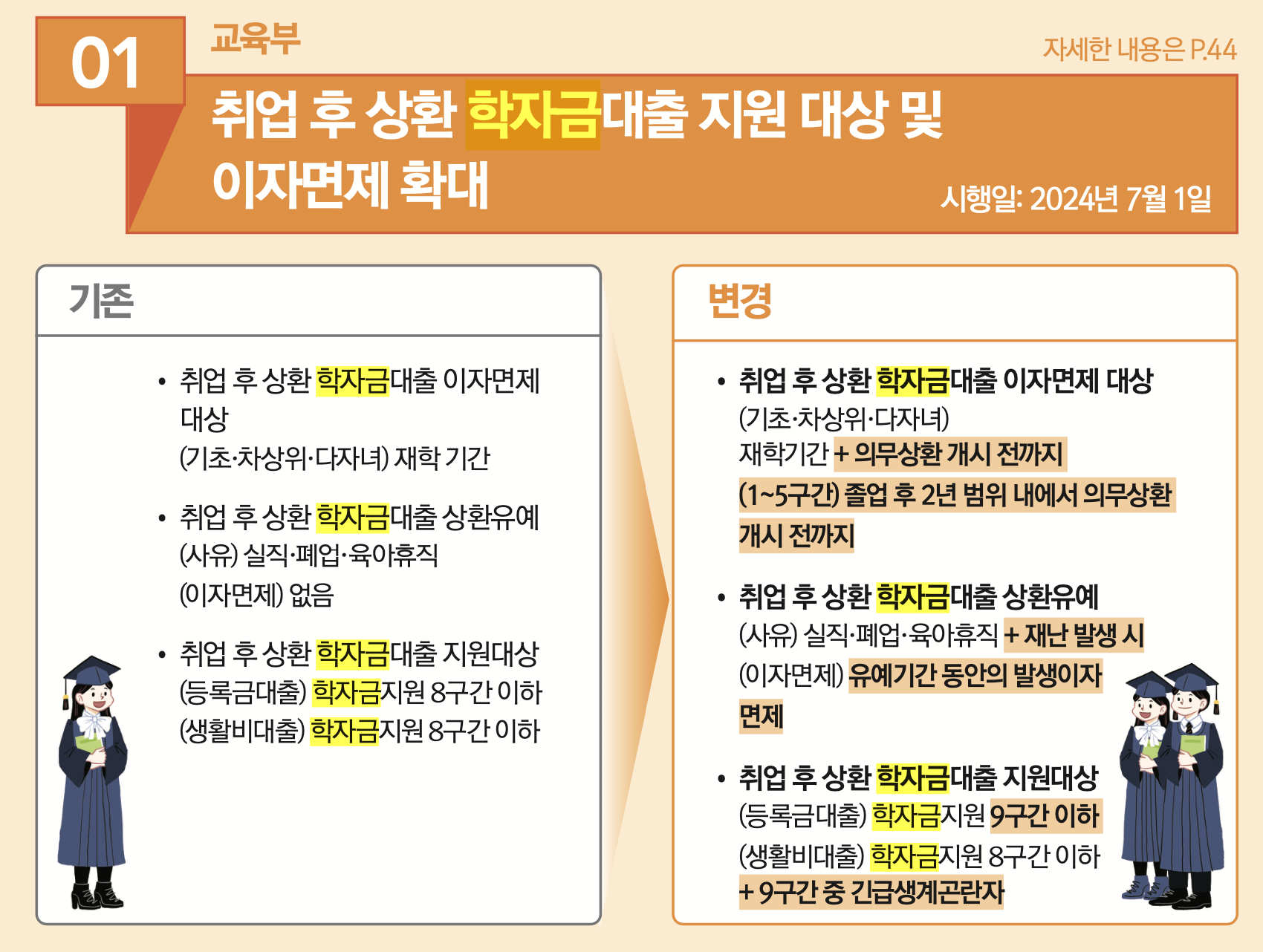 24년 하반기 이후 변경점(취업 후 상환 학자금 대출 지원 대상 및 이자 면제 확대 내용)